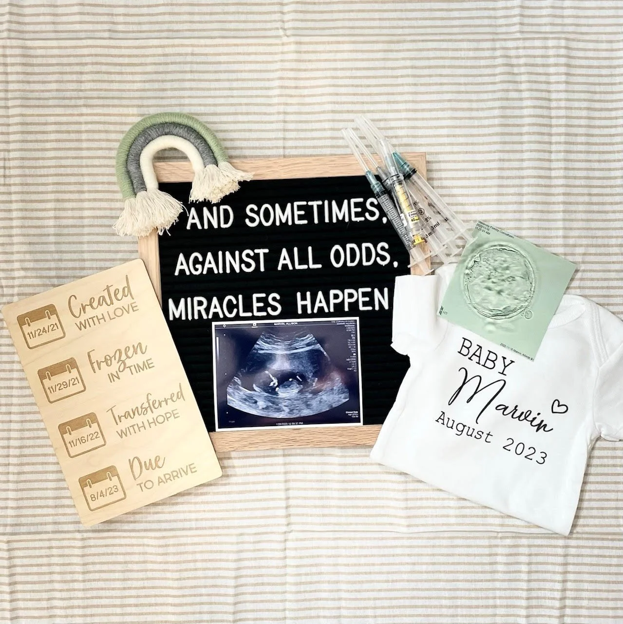 “Out of the four embryos tested, three were normal and one had Klinefelter syndrome (a genetic condition where a male has an extra X chromosome), which we wouldn’t transfer. We elected not to find out the genders of the three remaining embryos to keep one thing a surprise and it wasn’t until November 2022 that we did our last transfer. This transfer felt different than the first two. We were excited to be trying again but I was terrified this time around. I was terrified of being pregnant and having another miscarriage, but I was also terrified of never being pregnant again. I went into the transfer anticipating the roller coaster that was to come.